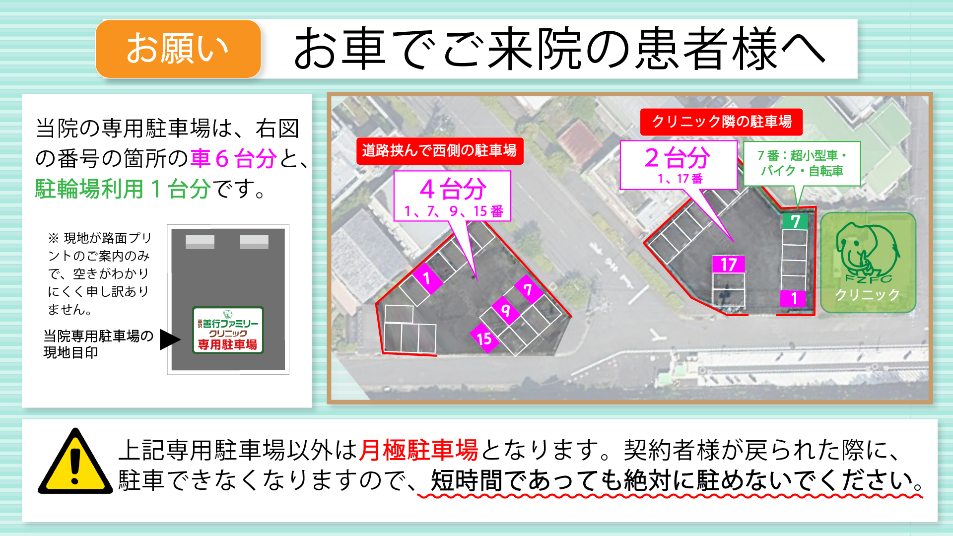 自転車でお越しの方で、当院専用駐輪場が利用できず、善行駅東口駐輪場をご利用された場合も、料金の精算について、受付にお声掛けください。