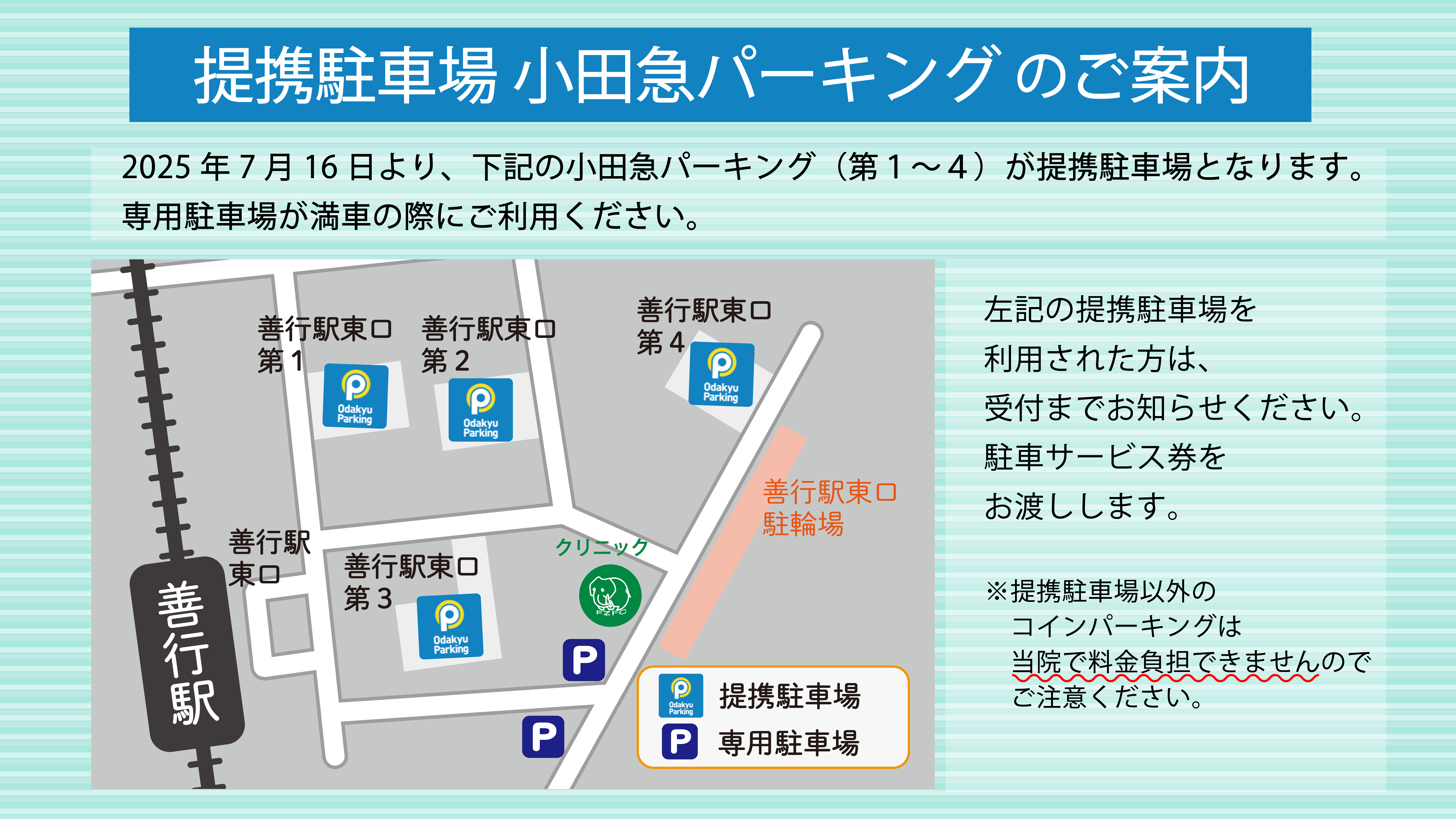 2025年7月より、提携コインパーキングが小田急パーキング善行駅東口第1〜第4に変更となりました。